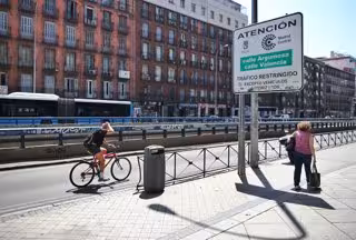 Distintivo de Madrid Central para el tráfico restringido en las calles Argumosa y Valencia, en Madrid (España), a 27 de julio de 2020. - Eduardo Parra - Europa Press