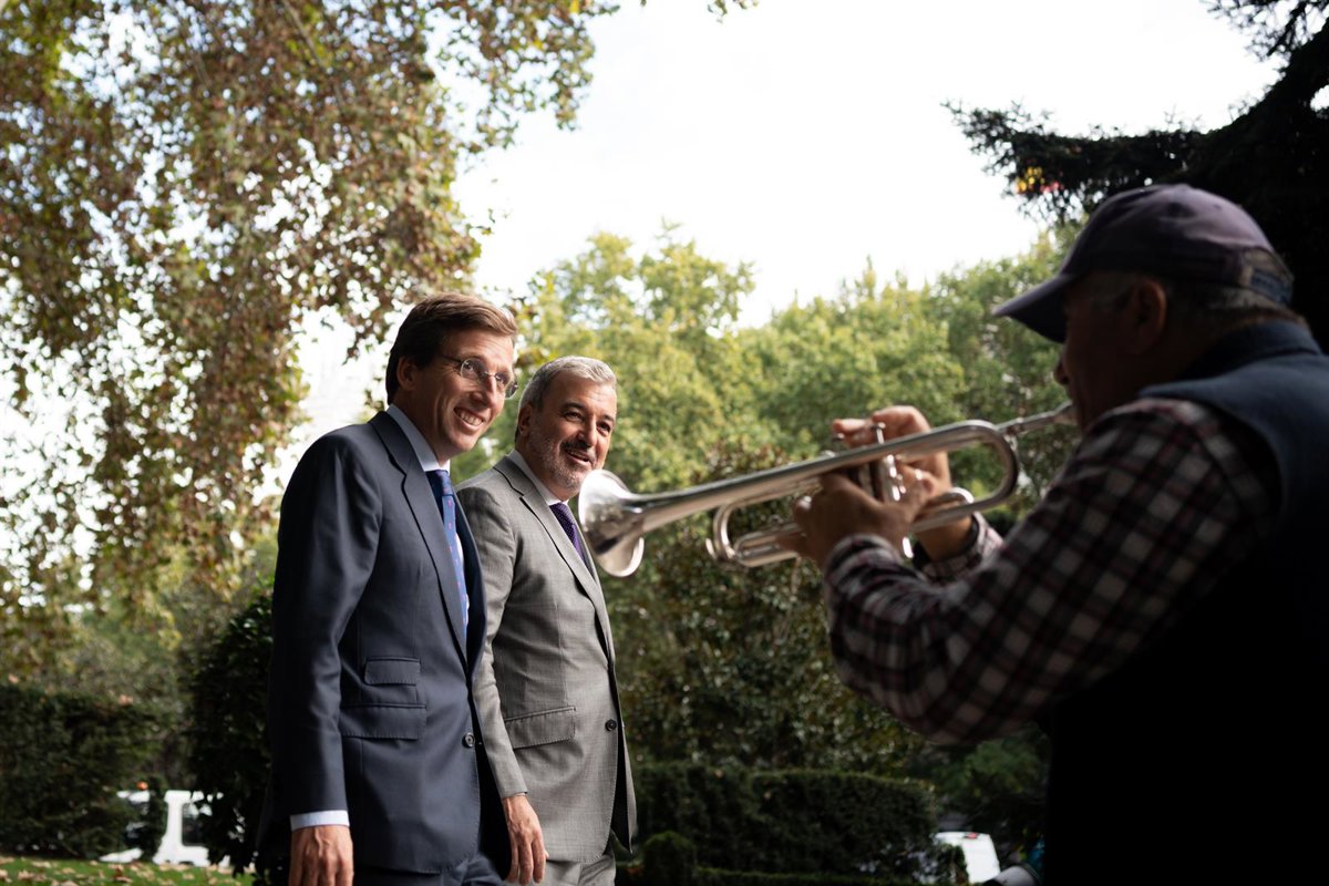 Un hombre toca la trompeta en la calle mientras que el alcalde de Madrid, José Luis Martínez-Almeida (i) y el alcalde de Barcelona, Jaume Collboni (d), dan un paseo por el Paseo del Prado, tras un encuentro institucional, en el Palacio de Cibeles, - Diego Radamés - Europa Press