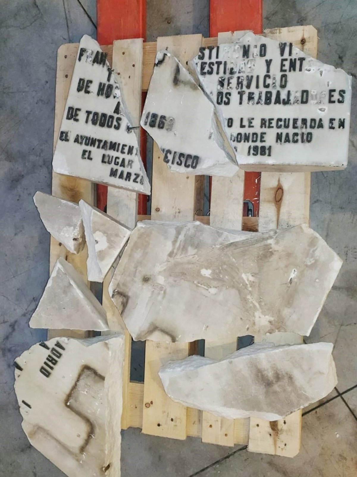 Archivo - Placa dañada que fue retirada de la antigua fachada de la vivienda donde residió el que fuera presidente de la II República Francisco Largo Caballero. - UGT - Archivo