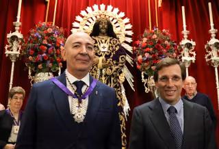 El alcalde de Madrid, José Luis Martínez-Almeida, y el concejal del distrito Centro, Carlos Segura, durante el Besapiés de la imagen del Cristo de Medinaceli, en la Basílica de Jesús de Medinaceli, a 7 de marzo de 2025, en Madrid (España). - Marta Fernández - Europa Press