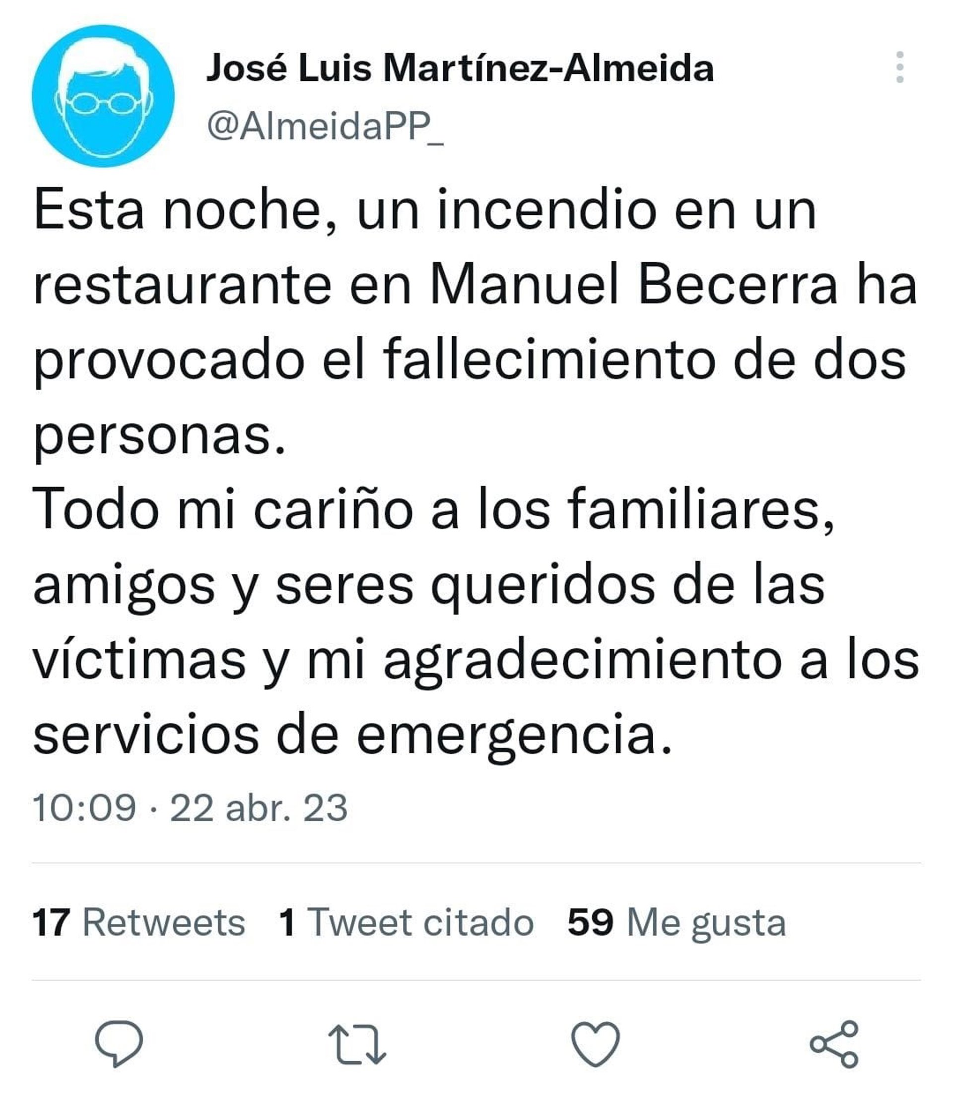 Tweet de José Luis Martínez Almeida en referencia al incendio de Manuel Becerra. - EUROPA PRESS