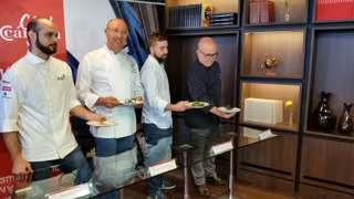 Pedro Larumbe, Paco Quirós, Mario Sandoval y Ricardo Sanz han elaborado este lunes para la Cámara de Comercio de Madrid cuatro tapas 'gourmet' con ingredientes típicos de la gastronomía madrileña para los emprearios socios del Club Cámara de Madrid.