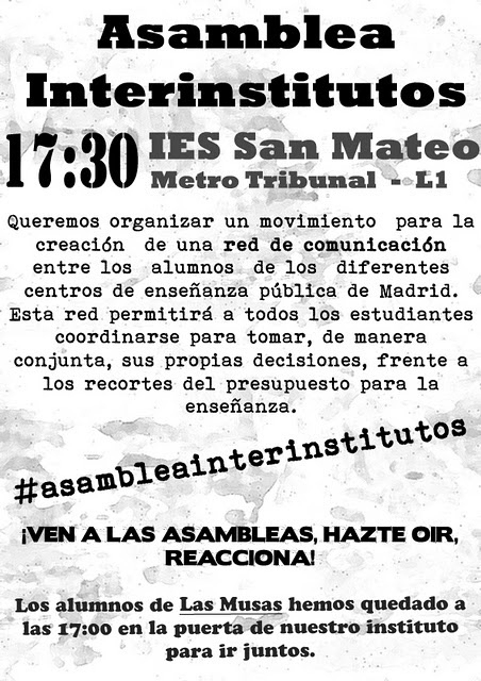 En la primera asamblea celebrada la semana pasada se dieron cita alumnos de quince institutos, según el acta recogida por Europa Press. Concretamente del IES Cervantes, Ciudad de los Poetas, Doctor Marañón, Fortuny, Gran Capitán, Gómez Moreno, Juan de la Cierva, La Musa, Madrid Sur, Puerta Bonita, Pío Baroja, Ramiro de Maeztu, San Isidro, San Juan Bautista y Siglo XXI. También estuvieron presentes alumnos del campus universitario de Somosaguas.