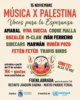Amaral, Viva Suecia, Coque Malla y Sidecars se sumarán al cartel del concierto solidario 'Música X Palestina - Voces para la Esperanza', impulsado por el Ayuntamiento de Fuenlabrada y que tendrá lugar el próximo día 15 de noviembre en el recinto Joaquín Sabina de la ciudad, y en el que ya estaban confirmados nombres como Fetén Fetén, Iván Ferreiro, Marwán, M-Clan, Rozalén, Rubén Pozo y Travis Birds.
