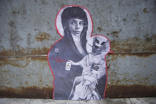 Los 'collages' muestran la cara de la concejala cubierta por un manto, personificando así a la Virgen María. En sus brazos sostiene a un bebé con cabeza de perro furioso que, a su vez, lleva en la mano un spray de graffitero.