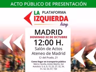 Antiguos cargos de IUCM han decidido crear un nuevo proyecto, la plataforma 'La Izquierda Hoy', que presentarán este domingo en el Ateneo de Madrid y que persigue, de cara a las elecciones autonómicas y municipales de 2019, recuperar el espacio de la izquierda entregado "al populismo".