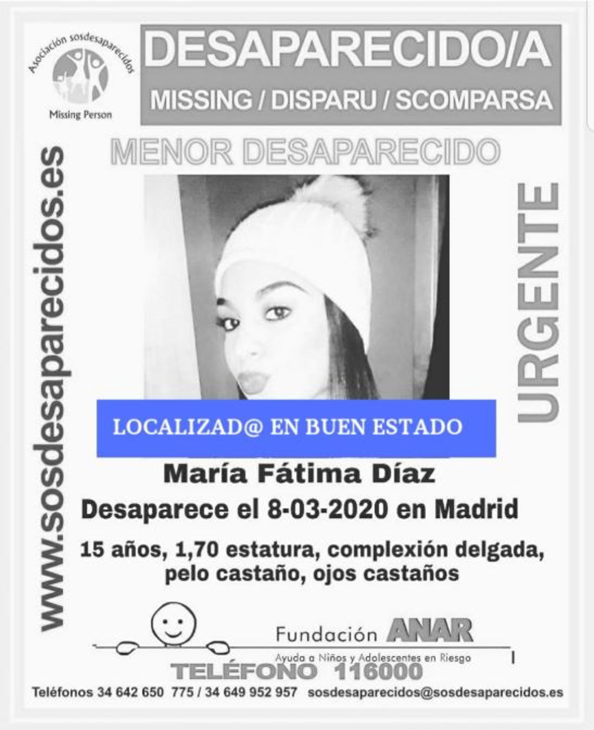 La menor de 15 años desaparecida en Madrid desde el pasado domingo ha sido localizada en buen estado tras haberse fugado "voluntariamente" de su casa, ha confirmado SOS Desaparecidos a través de Twitter.