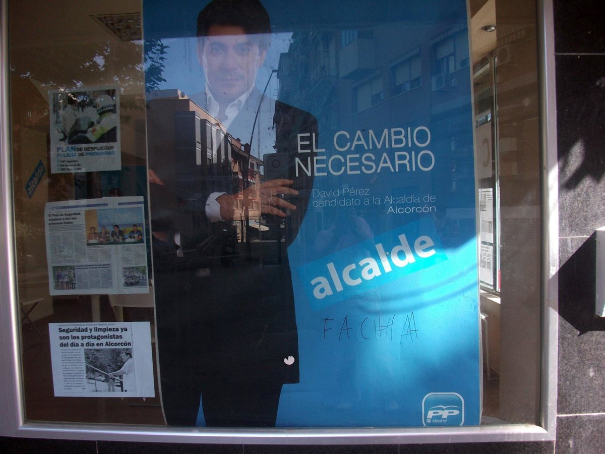 El alcalde de Alcorcón, David Pérez, ha denunciado este martes la aparición de nuevas pintadas en la sede del PP en la localidad, en esta ocasión con la palabra "facha" escrita en una de las cristaleras sobre la foto del responsable municipal.