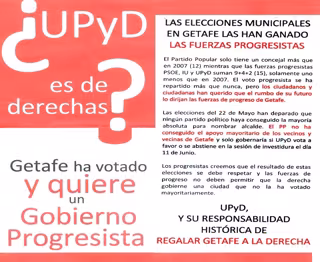 En estos panfletos, de color rojo y blanco y sin firma, se plantea la pregunta de si UPyD, que ha obtenido dos concejales y que previsiblemente se abstendrá el sábado para permitir que gobierne la lista más votada --la del PP-- es un partido "de derechas". Además, se subraya que Getafe "ha votado y quiere un Gobierno progresista".