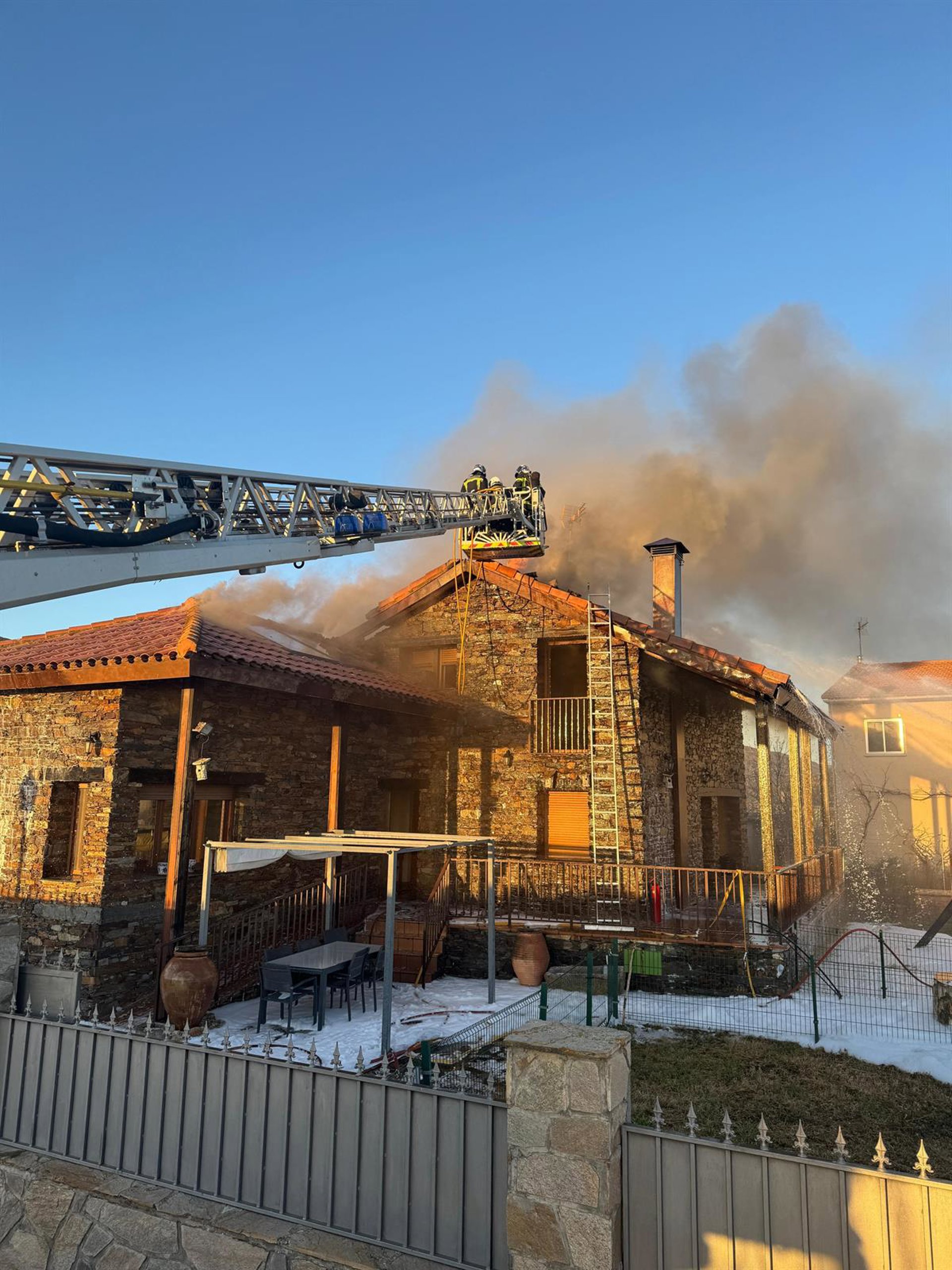 Trabajan en el terreno nueve dotaciones de bomberos de la Comunidad, incluidas dos auto escalas que están retirando las tejas de la cubierta para apagar el incendio, que se sitúa en la estructura interior.