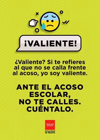 La Comunidad de Madrid comienza este martes su campaña de sensibilización contra el acoso escolar que tendrá una duración de un mes con el lema 'Ante el acoso escolar, no te calles. Cuéntalo', que incluye spots, cuñas radiofónicas y gráficas que se difundirán en medios de comunicación, redes sociales y cartelería exterior.