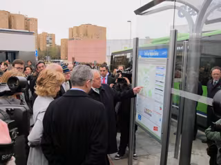 El gerente del Consorcio Regional de Transportes, José Manuel Pradillo, les ha explicado que se trata de la primera vez que en Madrid cogen una plaza para convertirla en un intercambiador de autobuses. Se ha respetado una fuente que había anteriormente, y toda la arboleda, que se ha replantado posteriormente.