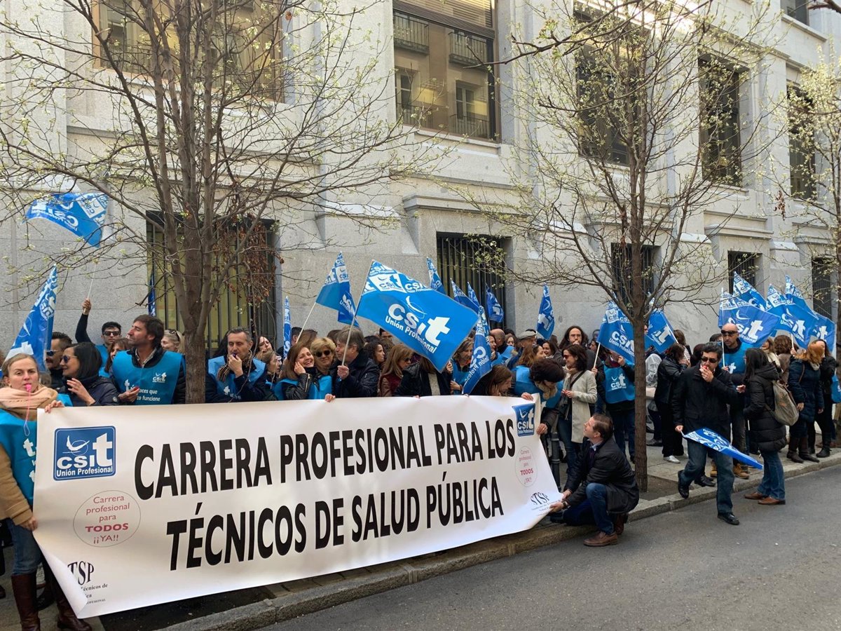 Aparte, alrededor de un centenar de técnicos y diplomados de Salud Pública, convocados por CSIT Unión Profesional a través del Sindicato de Técnicos de Salud Pública (STSP), se han concentrado frente a la Dirección General de la Función Pública.