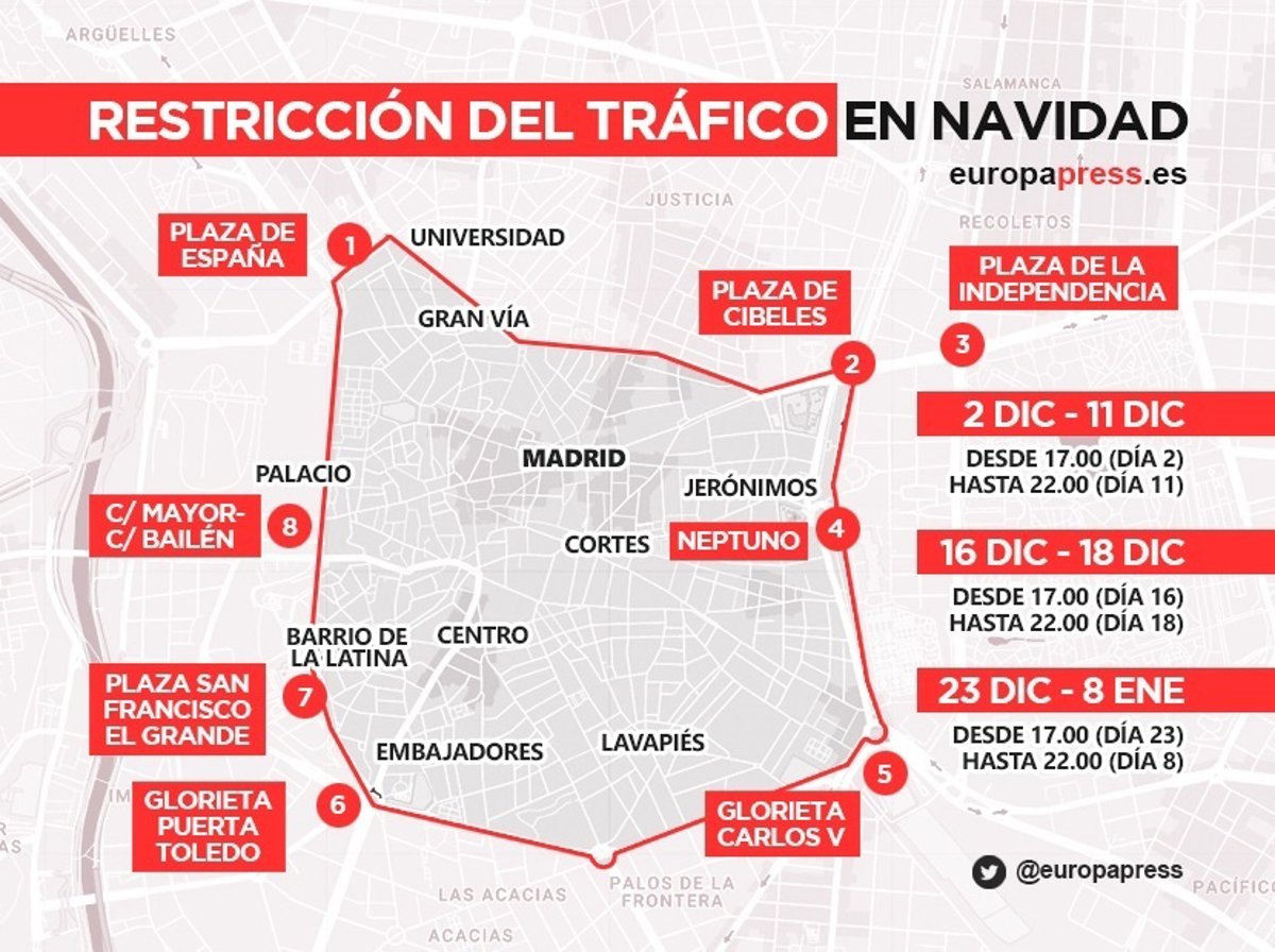 El cierre se aplicará desde este viernes al 11 de diciembre, el fin de semana del 16 al 18 de diciembre, y del 23 de diciembre al 8 de enero de 2017. La delegada de Medio Ambiente y Movilidad, Inés Sabanés, ya firmó el decreto que autoriza la reordenación y restricciones del tráfico en el centro de la ciudad.