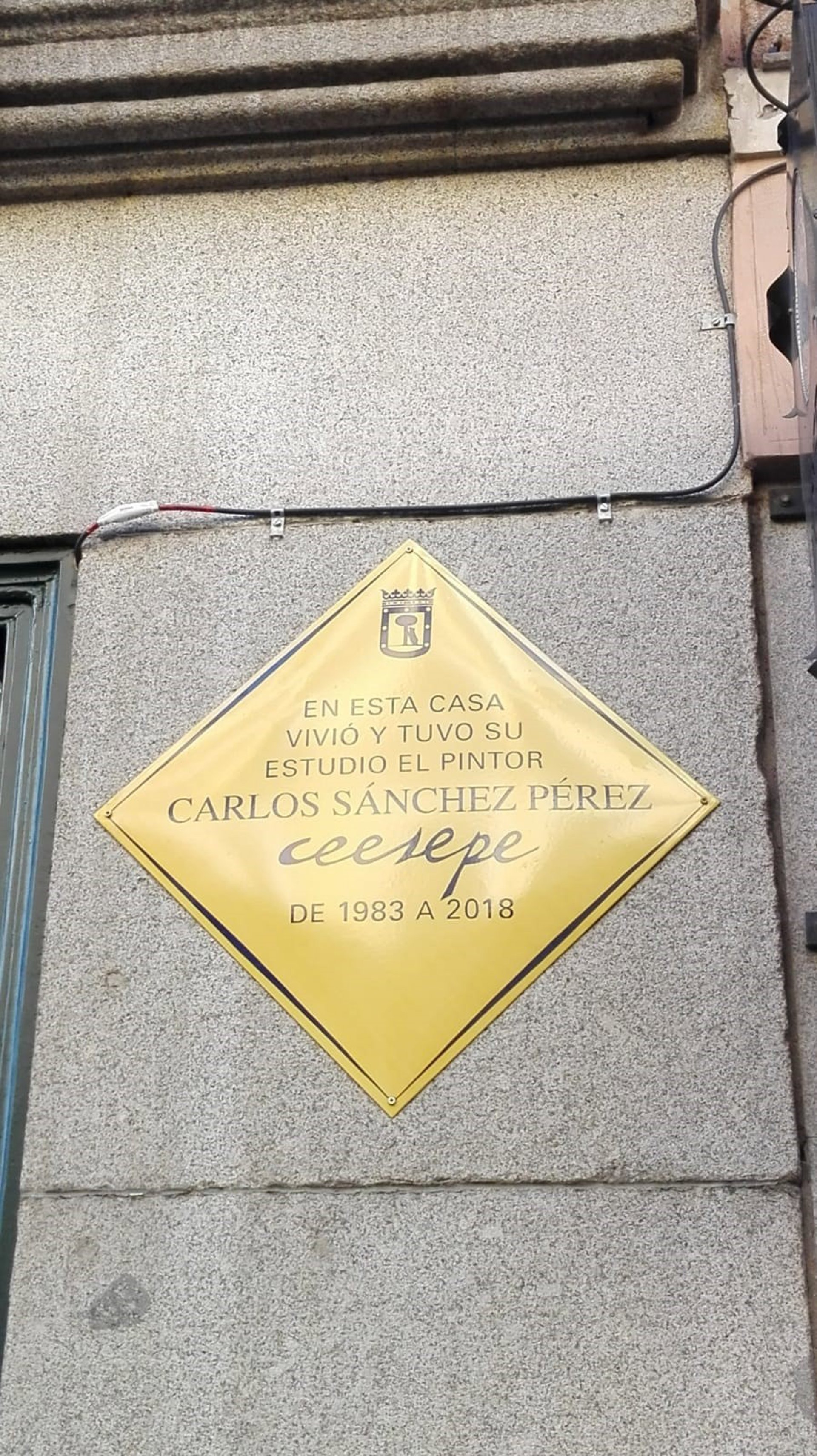 El ilustrador y pintor Carlos Sánchez, 'Ceesepe', cuenta ya con una placa en su honor ubicada en su estudio, el número 23 de la céntrica calle Mayor, un rombo de latón que resuma el arte pop y el Madrid "canalla" del que hizo gala el artista, que destacó por sus colaboraciones con Miquel Barceló, Javier Mariscal o Pedro Almodóvar. El pintor de La Movida falleció el 7 de septiembre de 2018.