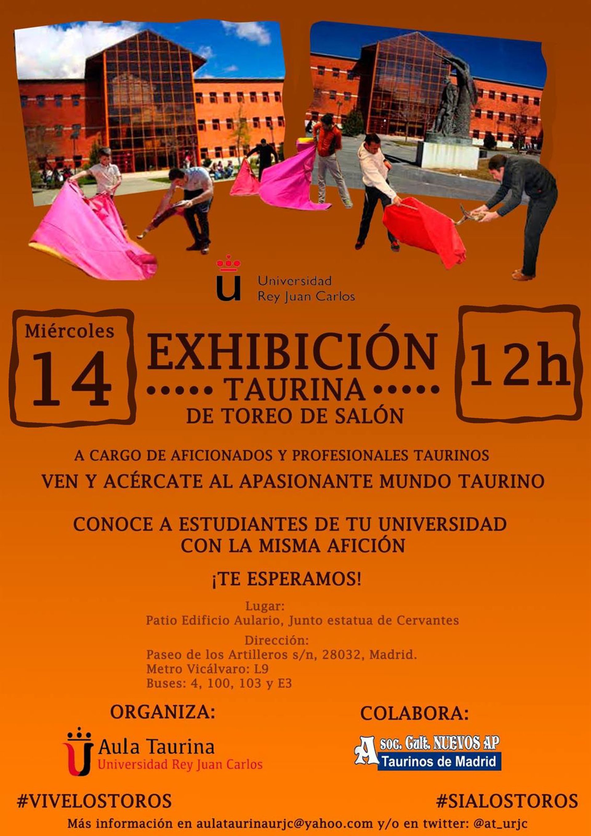 La Asociación Aula Taurina de la Universidad Rey Juan Carlos (URJC) organizará el próximo miércoles 14 de mayo, a las 12.00 horas, una exhibición de Toreo de Salón en el Campus de Vicálvaro, según ha informado la organización este domingo en un comunicado.
