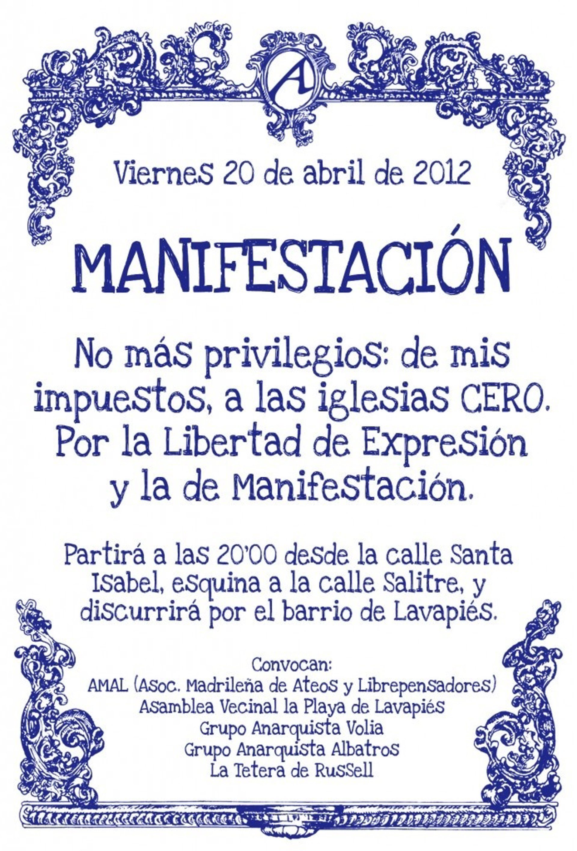 La marcha partirá a las 20 horas del cruce de la calle Santa Isabel con la calle Salitre, de Madrid, donde los participantes reclamarán "el fin de los privilegios de las iglesias, la libertad de expresión y el fin, de una vez, de este Estado católico que el que viven los ciudadanos".