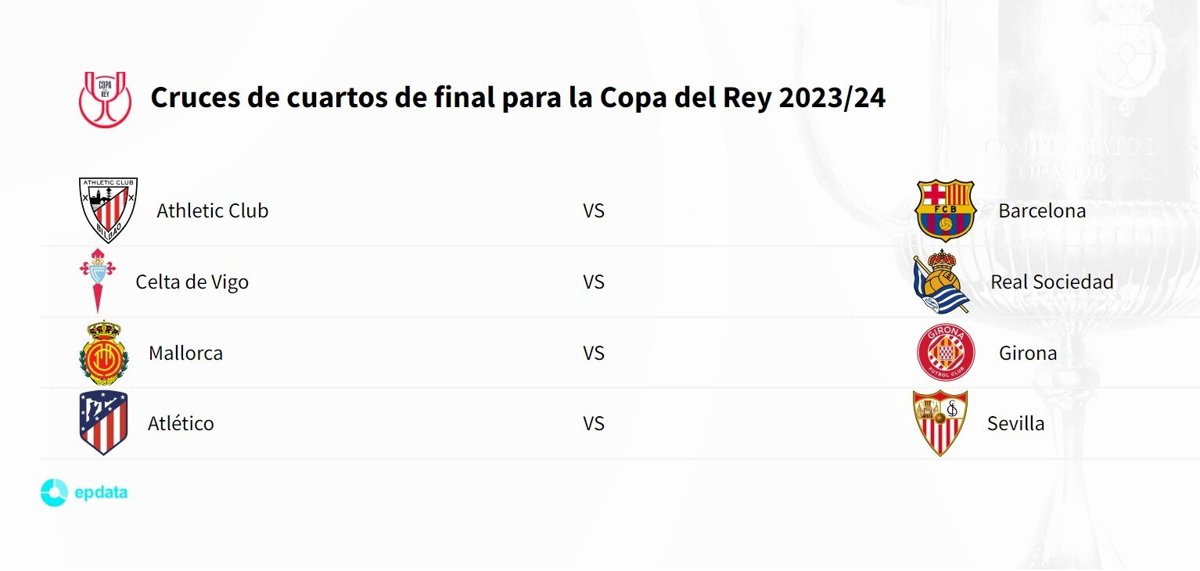 Athletic Club-FC Barcelona, RC Celta-Real Sociedad y RCD Mallorca-Girona FC completan los emparejamientos de la ronda, que se disputará la próxima semana, será la última eliminatoria a partido único y se jugarán en el campo del equipo que salga en primer lugar en el sorteo.