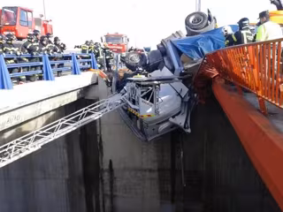 Como consecuencia del golpe, el trailer ha volcado lateralemnte sobre la calzada y la cabina ha quedado colgando sobre un puente de unos 9 metros de altura. El conductor ha quedado atrapado en la cabina y todavía los servicios sanitarios no han podido acceder a él, pero en principio se piensa que está herido leve.