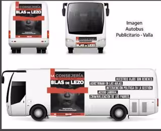 El autobús está rotulado con la imagen en blanco y negro de un niño con una raya roja a la altura de los ojos y el mensaje: "La Consejería secuestra el CEIP Blas de Lezo", en un lateral y en la parte trasera. Además, muestra los mensajes: "Nuestros hijos son rehenes. Adoctrinan en las aulas. Intervención política en la gestión. Acoso laboral. Criminalización de los padres".