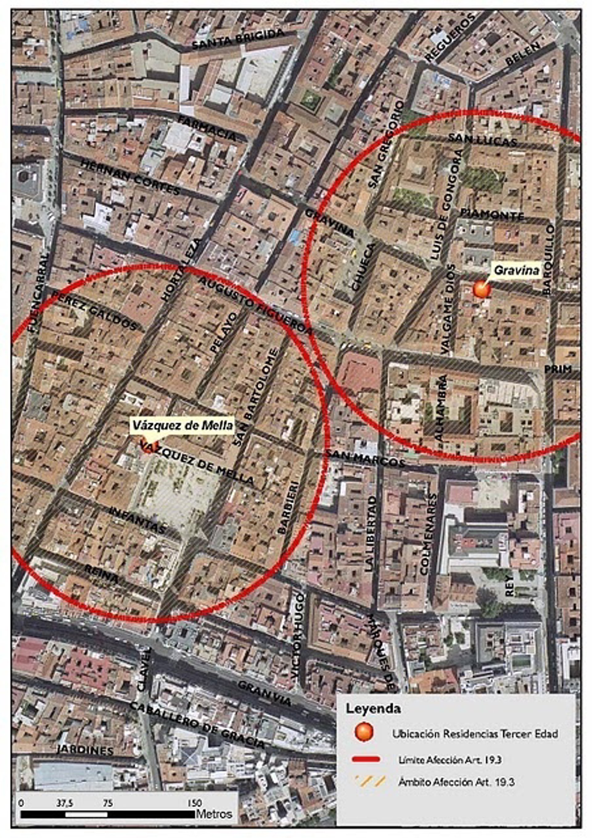 Según ha explicado el presidente de la asociación, Esteban Benito, a Europa Press, un informe técnico realizado por el ingeniero técnico de Telecomunicaciones Eugenio García-Calderón a petición de los vecinos engloba prácticamente todo el barrio de Chueca bajo este precepto, ya que tanto en la calle Gravina, 20 como en Vázquez de Mella, 3 existen sendas residencias de ancianos.