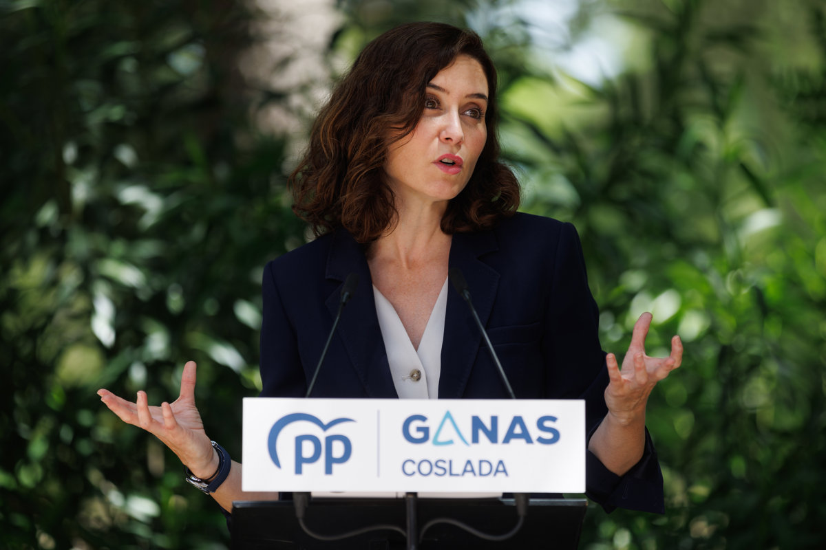 La presidenta de la Comunidad y candidata a la reelección, Isabel Díaz Ayuso, interviene durante un encuentro con afiliados y simpatizantes del PP de Coslada, a 10 de mayo de 2023, - Eduardo Parra - Europa Press