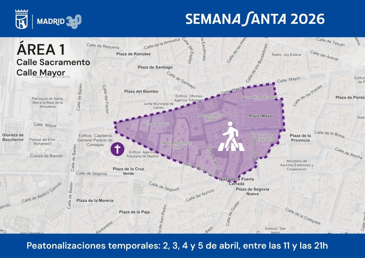 El Ayuntamiento de Madrid blindará las procesiones esta Semana Santa peatonalizando 22 calles en el entorno de parroquias ubicadas en Centro y Salamanca entre el 2 de abril, Jueves Santo, y el 5, Domingo de Resurrección.