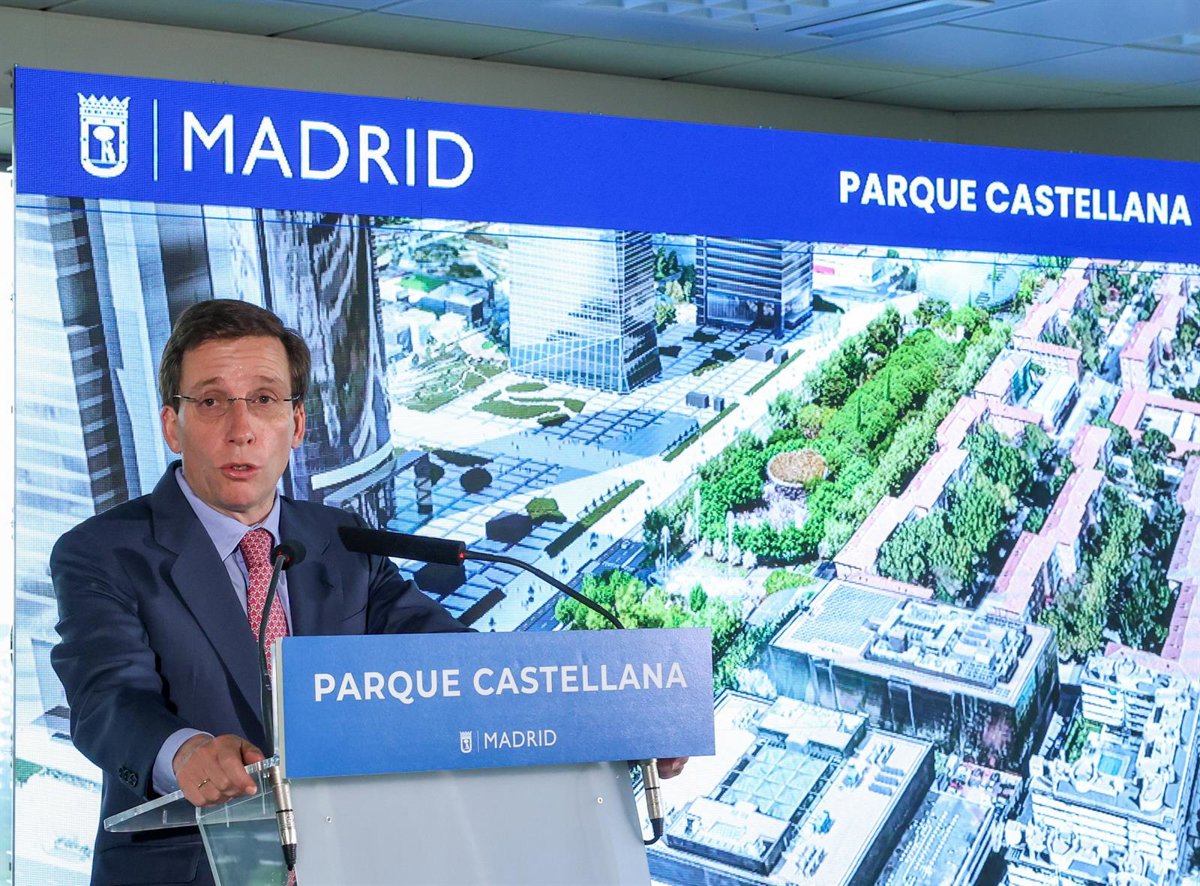 El alcalde de Madrid, José Luis Martínez-Almeida, interviene durante la presentación del proyecto ‘Parque Castellana’, en la Torre de Cristal - Marta Fernández - Europa Press