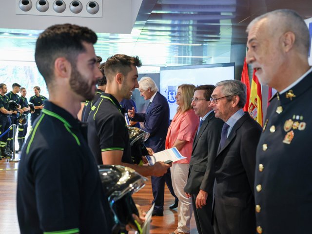 El alcalde, José Luis Martínez-Almeida, acompañado por la vicealcaldesa y delegada de Seguridad y Emergencias, Inmaculada Sanz, ha felicitado a los 85 nuevos bomberos especialistas del Ayuntamiento de Madrid que componen la nueva promoción del Cuerpo y que han recibido su diploma y placa que acreditan el final de su proceso selectivo. También ha estado presente el próximo consejero y actual director en funciones de la Agencia de Seguridad y Emergencias Madrid 112 de la Comunidad, Carlos Novillo.