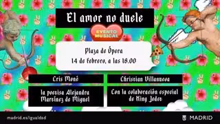 La iniciativa comenzará el 14 de febrero con un evento musical a partir de las 18 horas en la plaza de Ópera. Ahí, los cantantes Christian Villanueva y Cris Moné y la poetisa Alejandra Martínez de Miguel actuarán con el objetivo de transmitir a los adolescentes que el amor no es controlar a tu pareja a través del móvil, las redes sociales o controlarle la ropa, sino "una relación de igual a igual basada en el respeto de la autonomía y la libertad de las personas". También estará presente la influencer King Jedet.