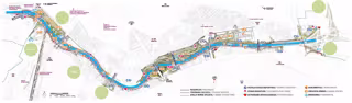 Así, se incluyen los pasos y puentes para cruzar de una margen a otra, la ubicación de los equipamientos deportivos y culturales, los miradores para contemplar la ciudad, los parques y jardines y el resto de elementos de este nuevo espacio urbano.