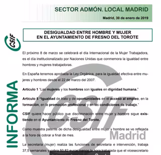 El Ayuntamiento de Fresno de Torote ha abierto expediente disciplinario a una trabajadora, afiliada a CSIF, que en los días previos al 8M, Día Internacional de la Mujer, denunció discriminación salarial con respecto a un compañero en una circular elaborada por el delegado del sindicato en la zona.