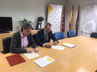 La primera teniente de alcalde del Ayuntamiento de Madrid y concejala del Área de Equidad, Derechos Sociales y Empleo, Marta Higueras, y el director general de la Fundación Gas Natural Fenosa, Martí Solà, han firmado el acuerdo en la sede de la EMVS.