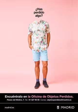 En las ilustraciones aparecen un hombre o una mujer sin cabeza en las que puede leerse "¿Has perdido algo?" y "encuéntralo en la Oficina de Objetos Perdidos".