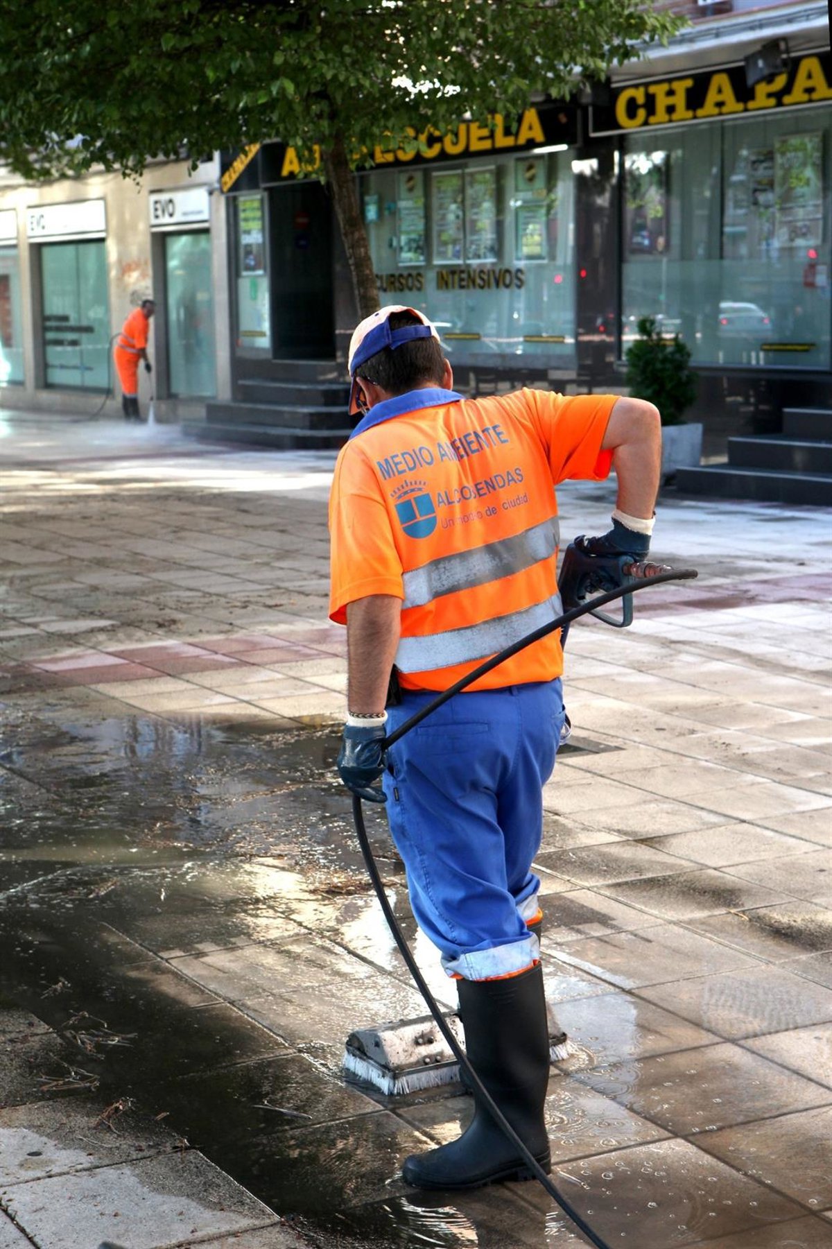 El Ayuntamiento de Alcobendas lleva a cabo estos días una limpieza de choque en el distrito Centro con el objetivo de mantener esa zona de la ciudad en las mejores condiciones. Entre las tareas hay que destacar el fregado de las aceras o la eliminación de pintadas de las fachadas.