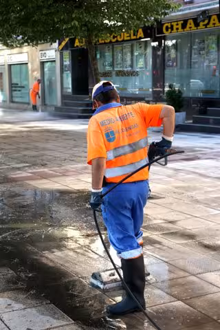 Siete operarios de la empresa concesionaria del servicio de limpieza, Cespa, realizan un baldeo mecánico de las calles, friegan las aceras, eliminan las pintadas de las fachadas y retiran viejos carteles que afean la ciudad. Para este trabajo cuentan con 2 furgones hidrolimpiadores, un remolque de agua caliente, un vehículo quita pintadas y una baldeadora.