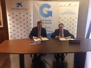 El alcalde de Getafe, Juan Soler, ha firmado este miércoles un convenio de colaboración con el director del Área Social de Fundación Bancaria 'la Caixa', Marc Simón, para desarrollar en La Alhóndiga el proyecto de Intervención Comunitaria Intercultural con el objetivo de fomentar la convivencia entre las distintas culturas de este barrio de Getafe.