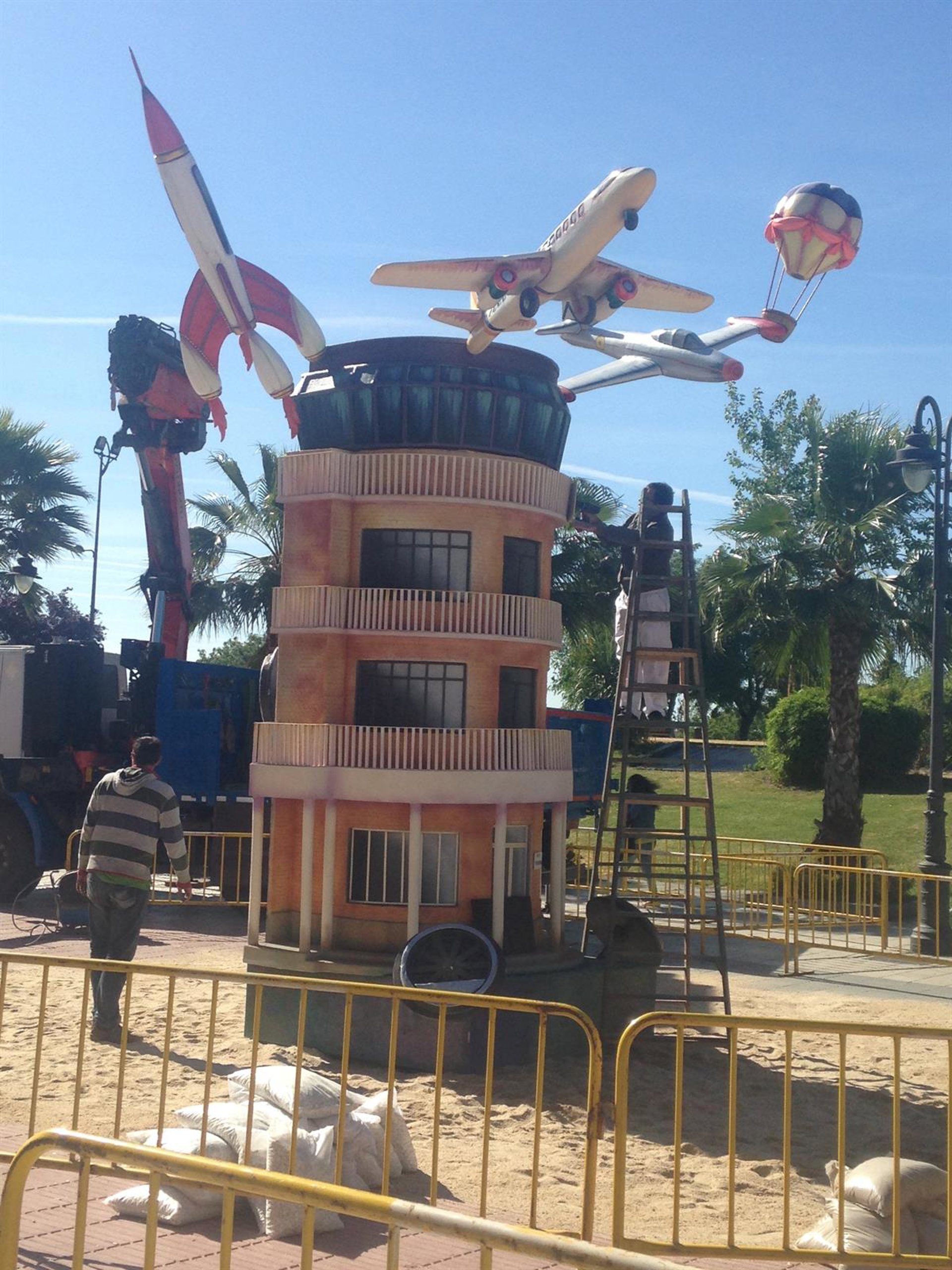 La figura principal de la falla es la torre de control de la base aérea de Getafe, que está rodeada de otros elementos simbólicos como una antigua máquina de vapor, un tren de alta velocidad, una bicicleta antigua, un cohete espacial, dos aviones, un Seat Seiscientos, un bólido de carreras antiguo, un globo aerostático, un autobús y un carromato.