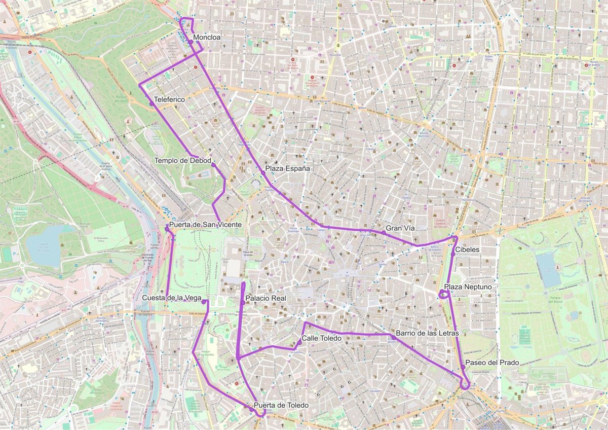 La ruta 1 es la del Madrid Histórico, que circulará por Paseo del Prado, Alcalá, Gran Vía, Princesa, Fernández de los Ríos, Arcipreste de Hita, Meléndez Valdés, Romero Robledo, Pintor Rosales, Ferraz, Irún, Arriaza, Cuesta de San Vicente, Virgen del Puerto, Paseo de la Ciudad de Plasencia, Ronda Segovia, Puerta de Toledo, Gran Vía San Francisco, Bailén, giro en la Plaza de la Armería, Bailén, Carrera de San Francisco, Plaza de la Cebada, Toledo, Colegiata, Tirso de Molina, Magdalena, Atocha, Plaza del Emperador Carlos V y Paseo del Prado. Constará de 14 paradas, recorrerá unos 14 kilómetros y su duración estimada en condiciones de tráfico normal en un día laboral será de 85 minutos.