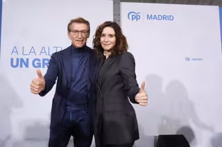 La presidenta de la Comunidad de Madrid, Isabel Díaz Ayuso y el presidente del PP, Alberto Núñez Feijóo, posan a su llegada a la segunda convención sectorial del Partido Popular - Marta Fernández Jara - Europa Press