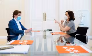 La presidenta de la Comunidad de Madrid, Isabel Díaz Ayuso, durante la reunión que ha mantenido con el alcalde de Madrid, José Luis Martínez-Almeida, para tratar sobre el cambio de Fase en la región por el COVID-19, a la que también han asistido el cons - Comunidad de Madrid - Archivo