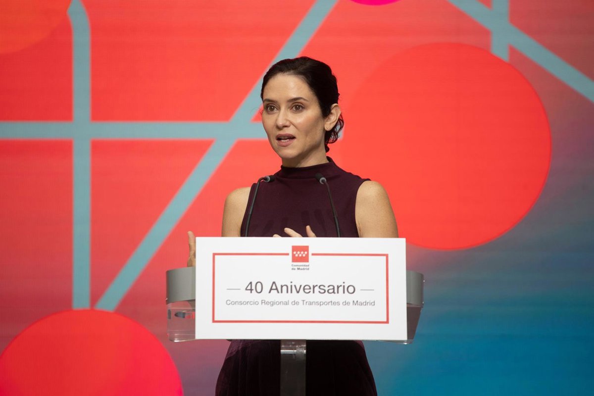 La presidenta de la Comunidad de Madrid, Isabel Díaz Ayuso, interviene durante el acto conmemorativo del 40º aniversario del Consorcio Regional de Transportes de Madrid - Alejandro Martínez Vélez - Europa Press