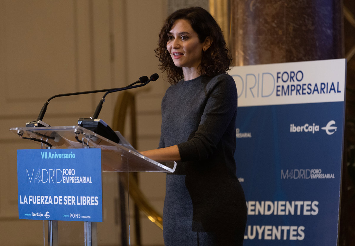 La presidenta de la Comunidad de Madrid, Isabel Díaz Ayuso, interviene durante el acto del VII aniversario de Madrid Foro Empresarial, en el Hotel Wellington, a 28 de noviembre de 2022, en Madrid (España). - Eduardo Parra - Europa Press