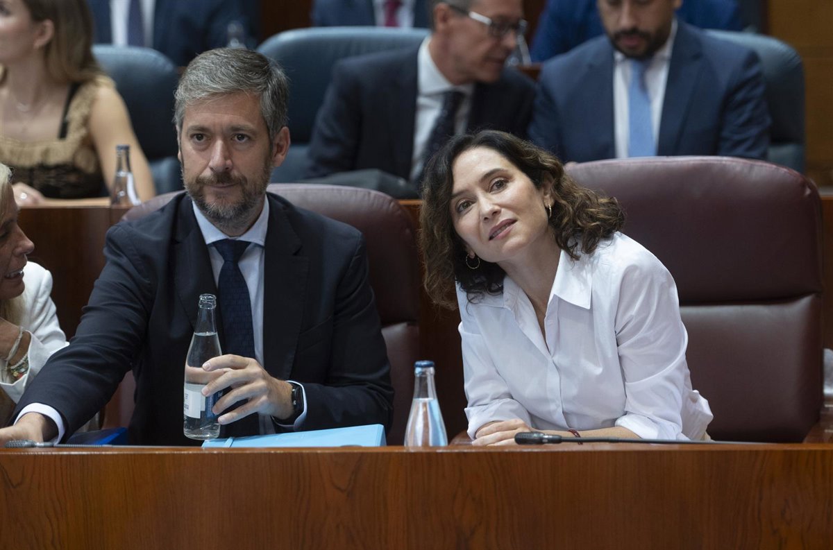 El consejero de la Presidencia, Miguel Ángel García y la presidenta de la Comunidad de Madrid, Isabel Díaz Ayuso, durante el segundo día del Debate sobre el Estado de la Región, en la Asamblea de Madrid, a 12 de septiembre de 2025, en Madrid (España). - Alberto Ortega - Europa Press