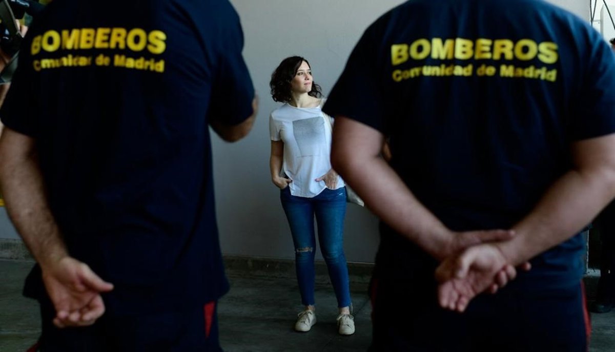 La candidata del PP a la Presidencia de la Comunidad de Madrid, Isabel Díaz Ayuso, visita a los bomberos de la Comunidad de Madrid en la localidad de Cadalso de los Vidrios. - DANI POZO/GPP