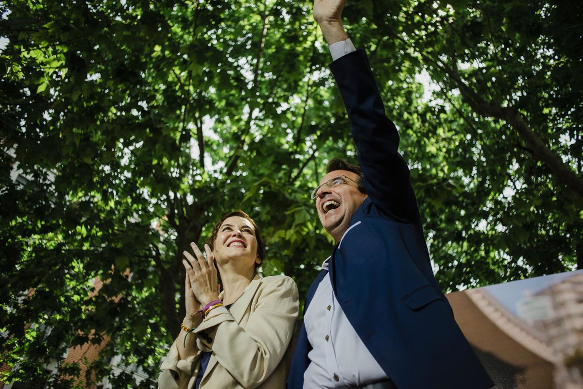 La presidenta de la Comunidad de Madrid y candidata del Partido Popular a la reelección, Isabel Díaz Ayuso, y el candidato del PP a la Alcaldía de Leganés, Miguel Ángel Recuenco, durante un mitin de campaña del PP, a 21 de mayo de 2023, en Leganés, Madr - Mateo Lanzuela - Europa Press