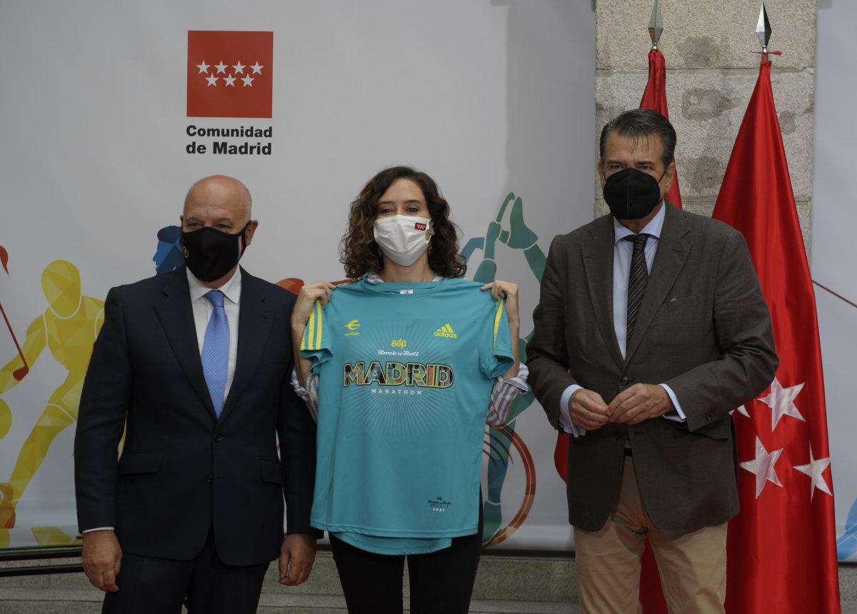 La presidenta de la Comunidad de Madrid, Isabel Díaz Ayuso, posa con una camiseta durante el acto por el que recibe el título de Maratoniana de Honor por parte de la Asociación Deportiva Maratón - Óscar Cañas - Europa Press