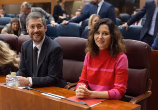 El Consejero de Presidencia, Justicia y Administración Local y es portavoz del gobierno de la Comunidad de Madrid, Miguel Ángel García Martín, y la Presidenta de la Comunidad de Madrid, Isabel Díaz Ayuso, durante un pleno de la Asamblea de Madrid - Eduardo Parra - Europa Press