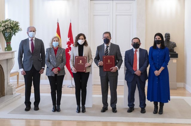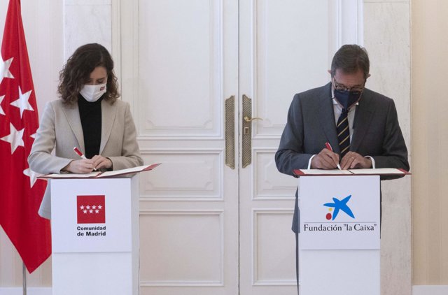 La presidenta de la Comunidad de Madrid, Isabel Díaz Ayuso, ha firmado hoy, en la Real Casa de Correos, un acuerdo marco con el director general de la Fundación 'la Caixa', Antonio Vila, que contempla la colaboración en materia de acción social, científica, cultural y educativa.
