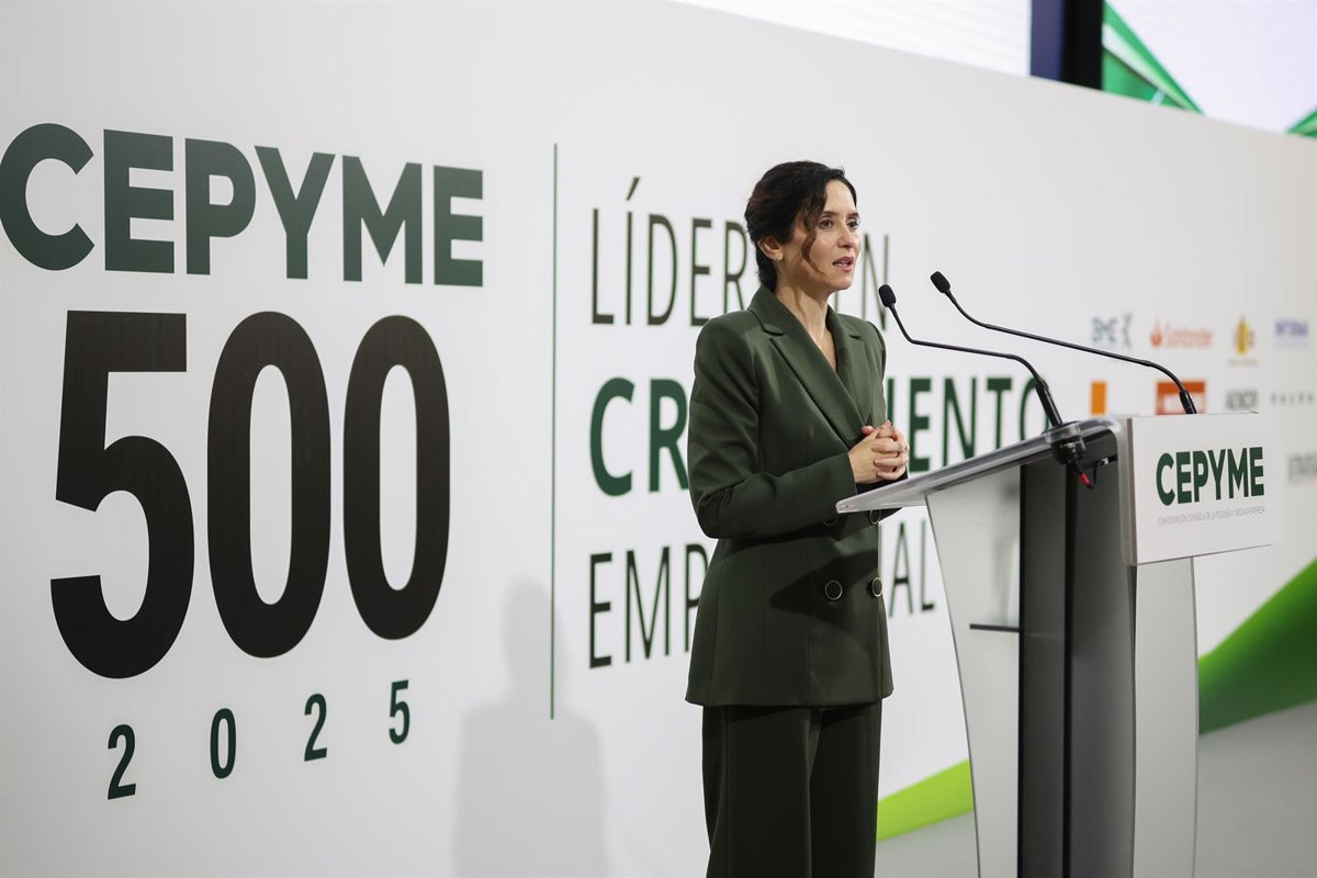 La presidenta de la Comunidad de Madrid, Isabel Díaz Ayuso, interviene durante la presentación de la IX edición de CEPYME500, en el Palacio de la Bolsa de Madrid, a 12 de noviembre de 2025, en Madrid (España). La novena edición de CEPYME500 reconoce a las - Alejandro Martínez Vélez - Europa Press